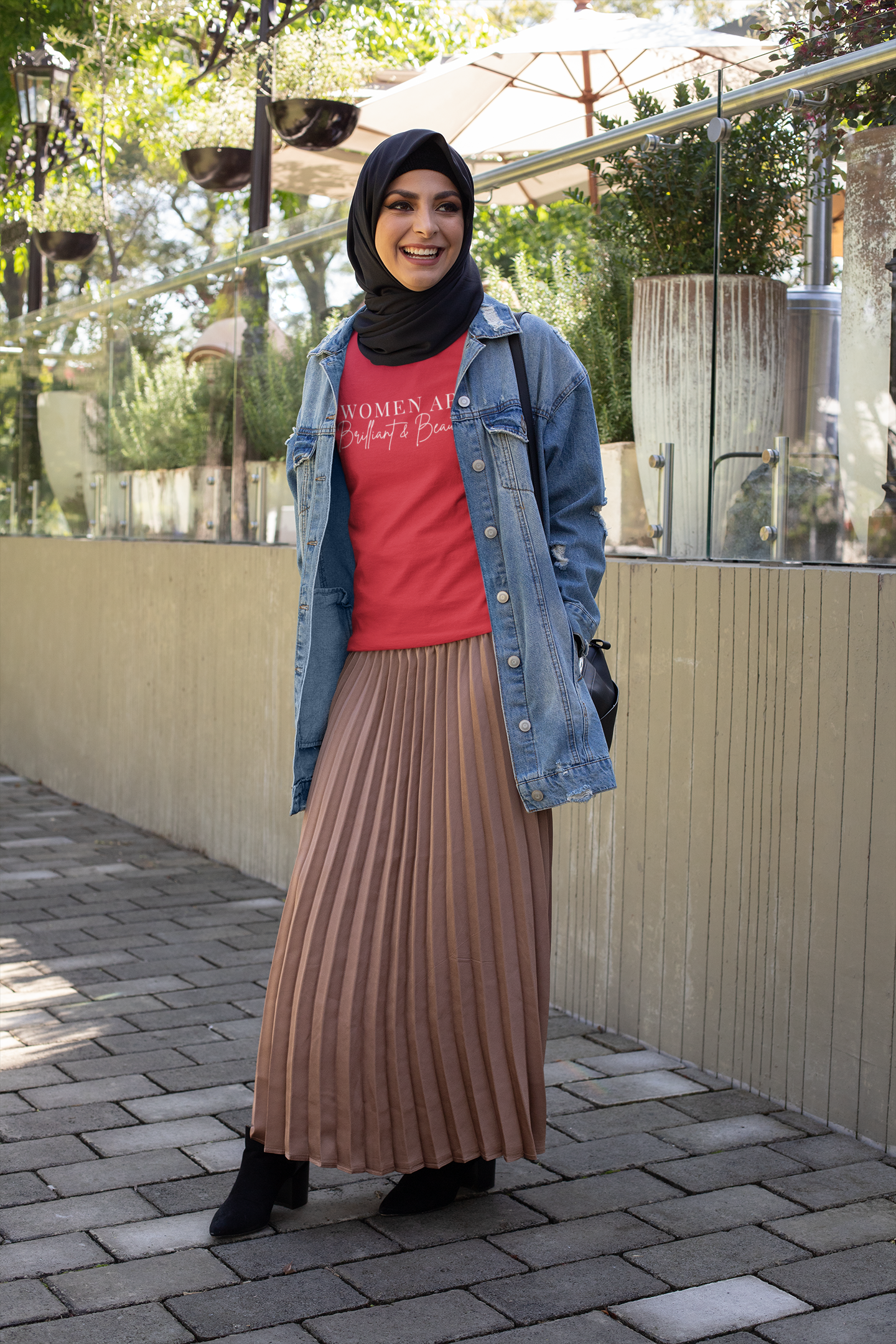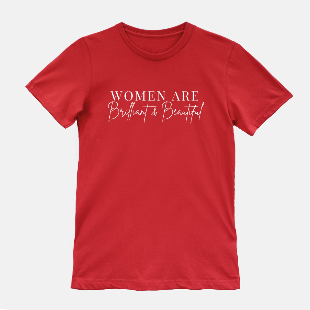 Details: Classic Short Sleeve Jersey Tee in Red with print featuring "Women are brilliant & beautiful".