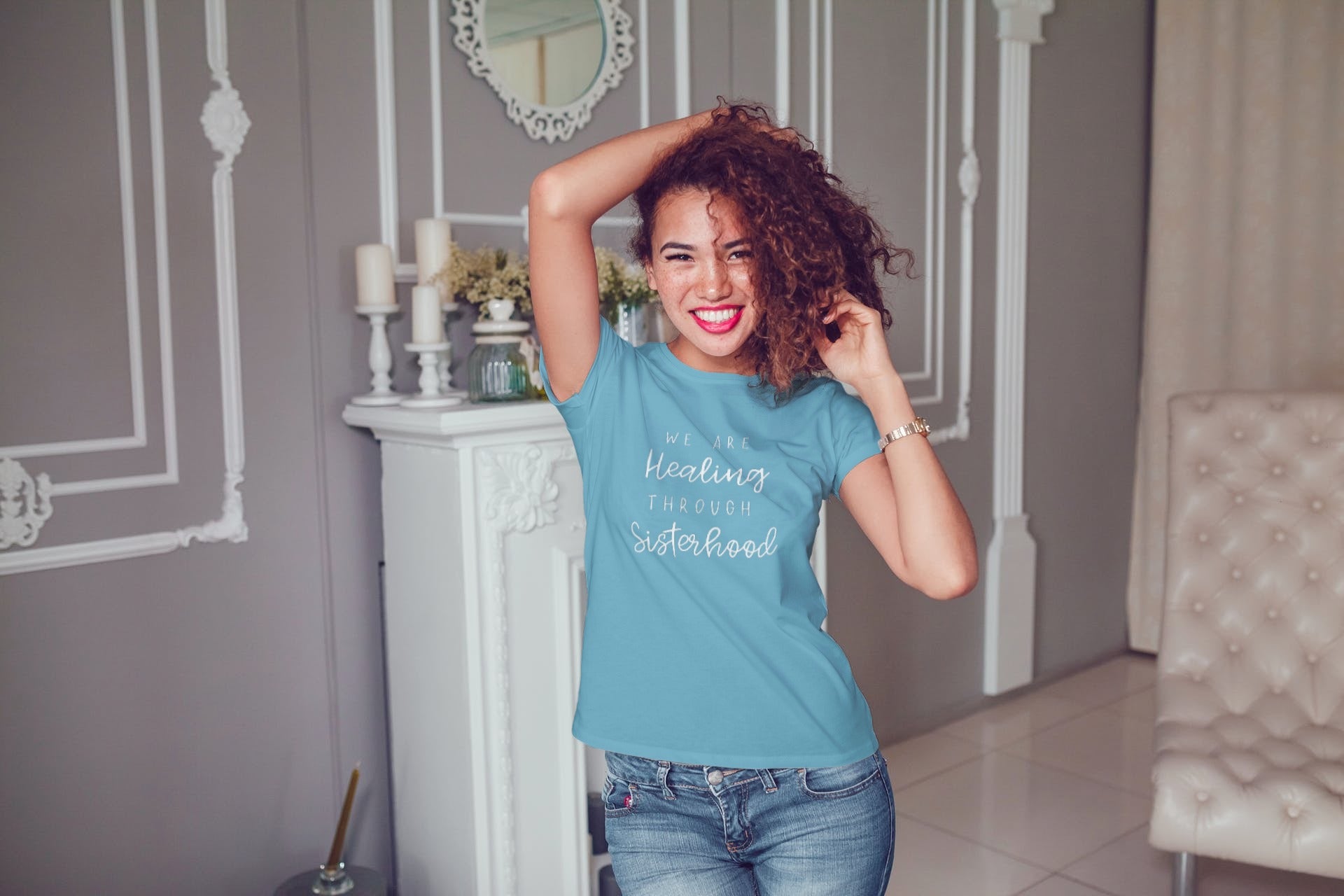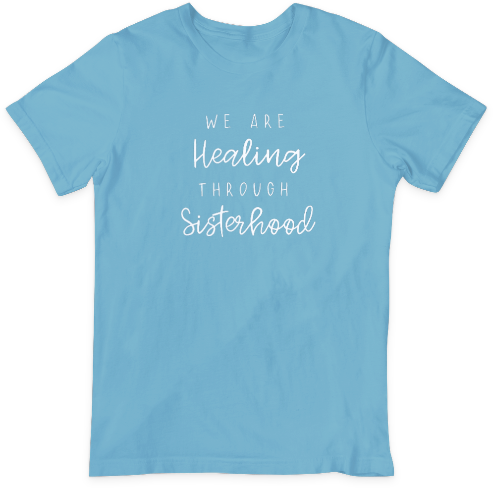 Details: Classic Short Sleeve Jersey Tee in "Ocean Blue" with print featuring "We are healing through sisterhood".
